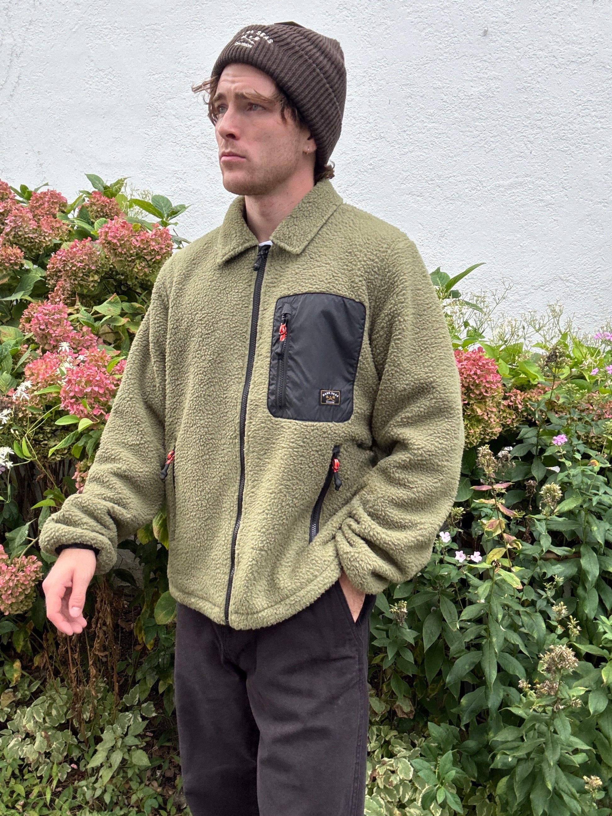 The Hancock delivers heavyweight warmth with a nod to vintage outdoor gear. Constructed from ultra-soft brushed sherpa fleece and lined with a southwest-inspired quilted taffeta, this zip-up jacket includes a zippered nylon chest pocket, waist pockets, and bold trident embroidery at the back.